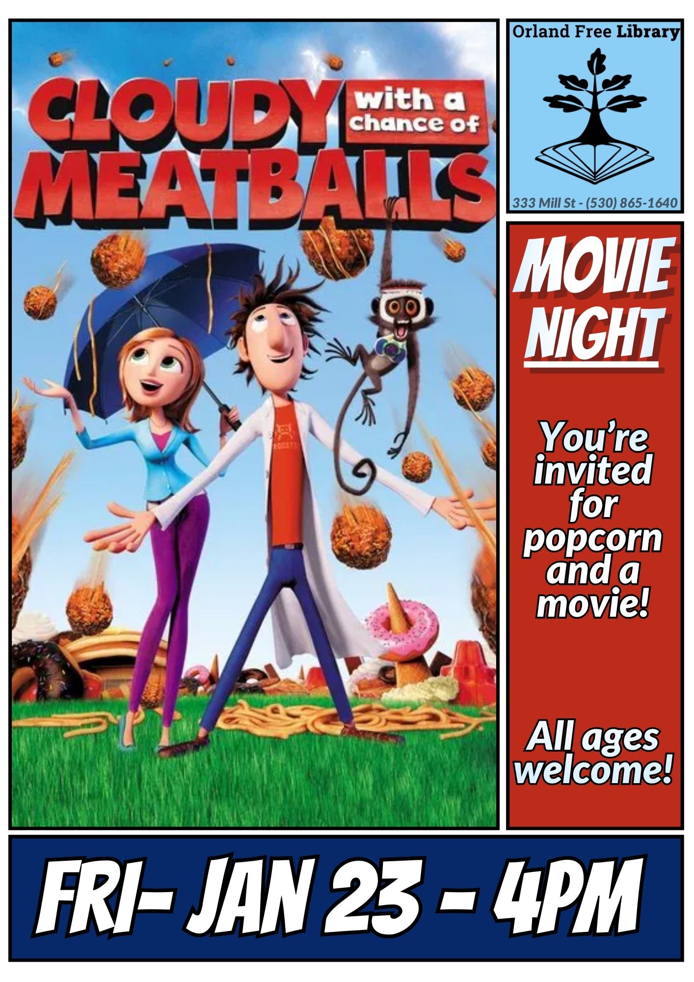 Join us for popcorn and a movie! This month's showing will be Cloudy with a Chance of Meatballs.