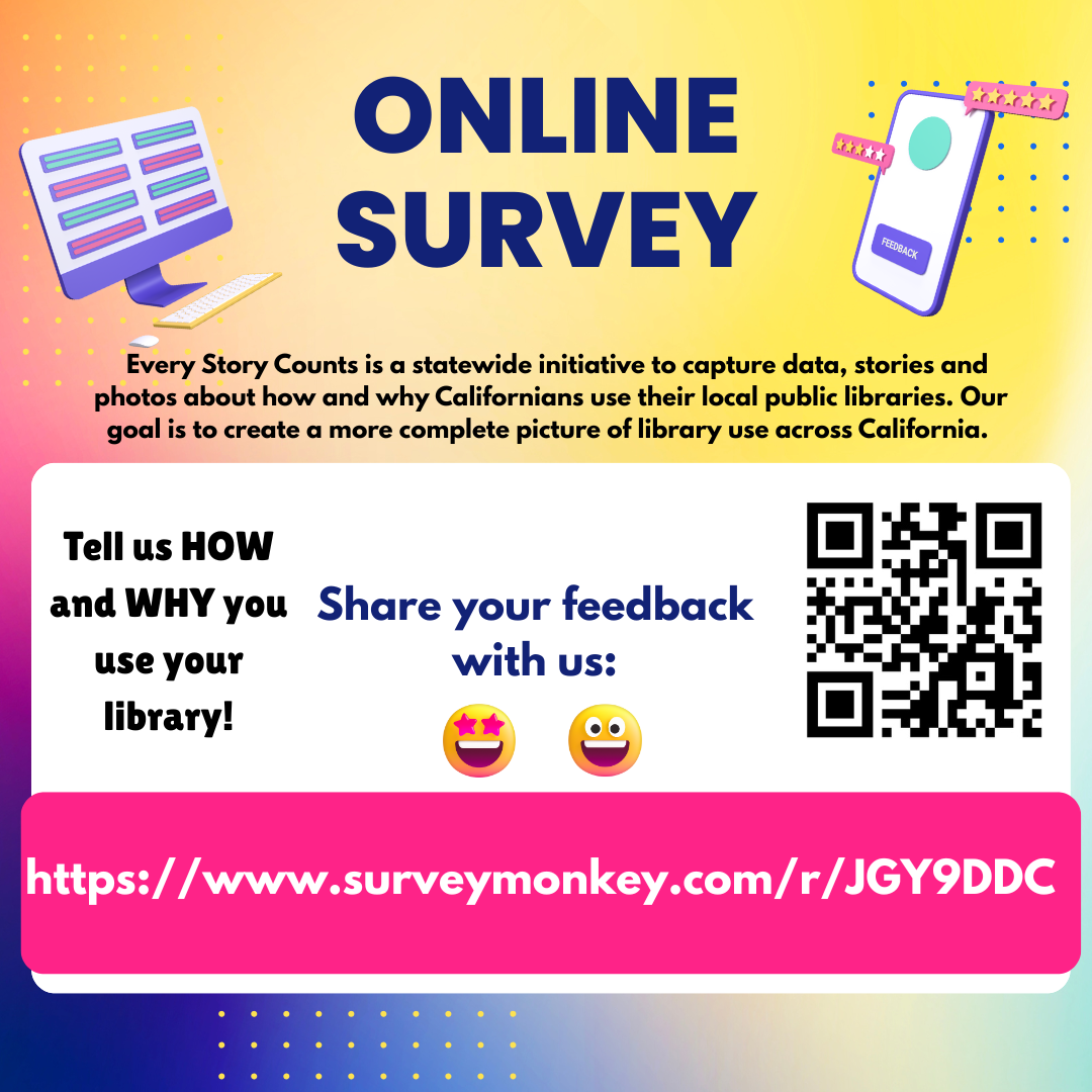 Tell us HOW and WHY you use your library. Every Story Counts is a statewide initiative to capture data, stories and photos about how and why Californians use their local public libraries. Our goal is to create a more complete picture of library use across California. This initiative will take place the week of January 25–31, 2026.