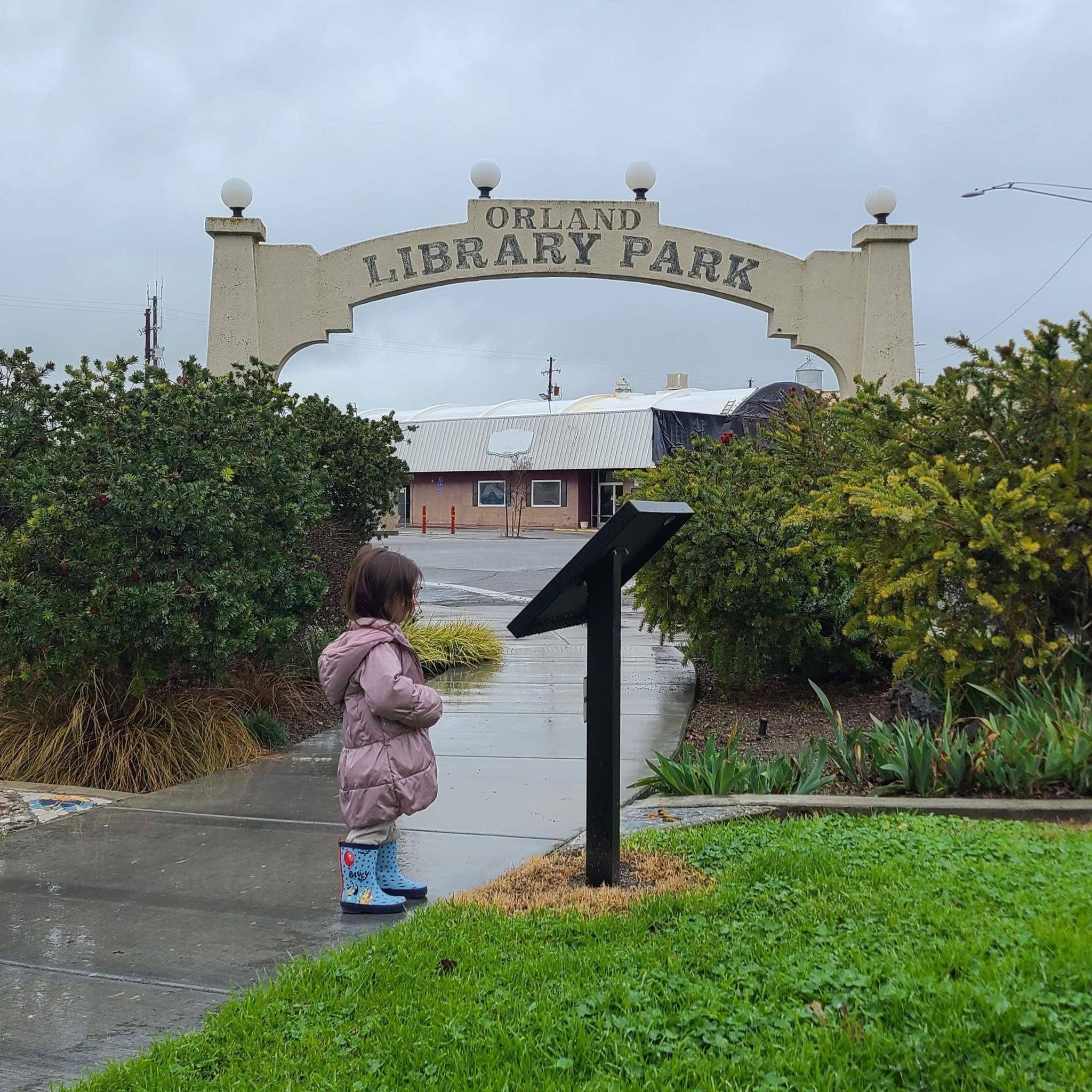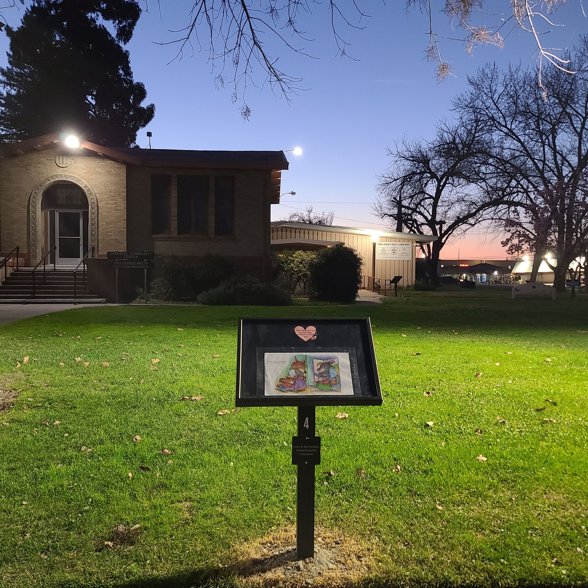 The pages of a children’s picture book are separated and placed in 16 sign panels and displayed along an outdoor path, allowing families and caregivers to read the story together as they walk through the Library Park at 333 Mill St. in Orland.