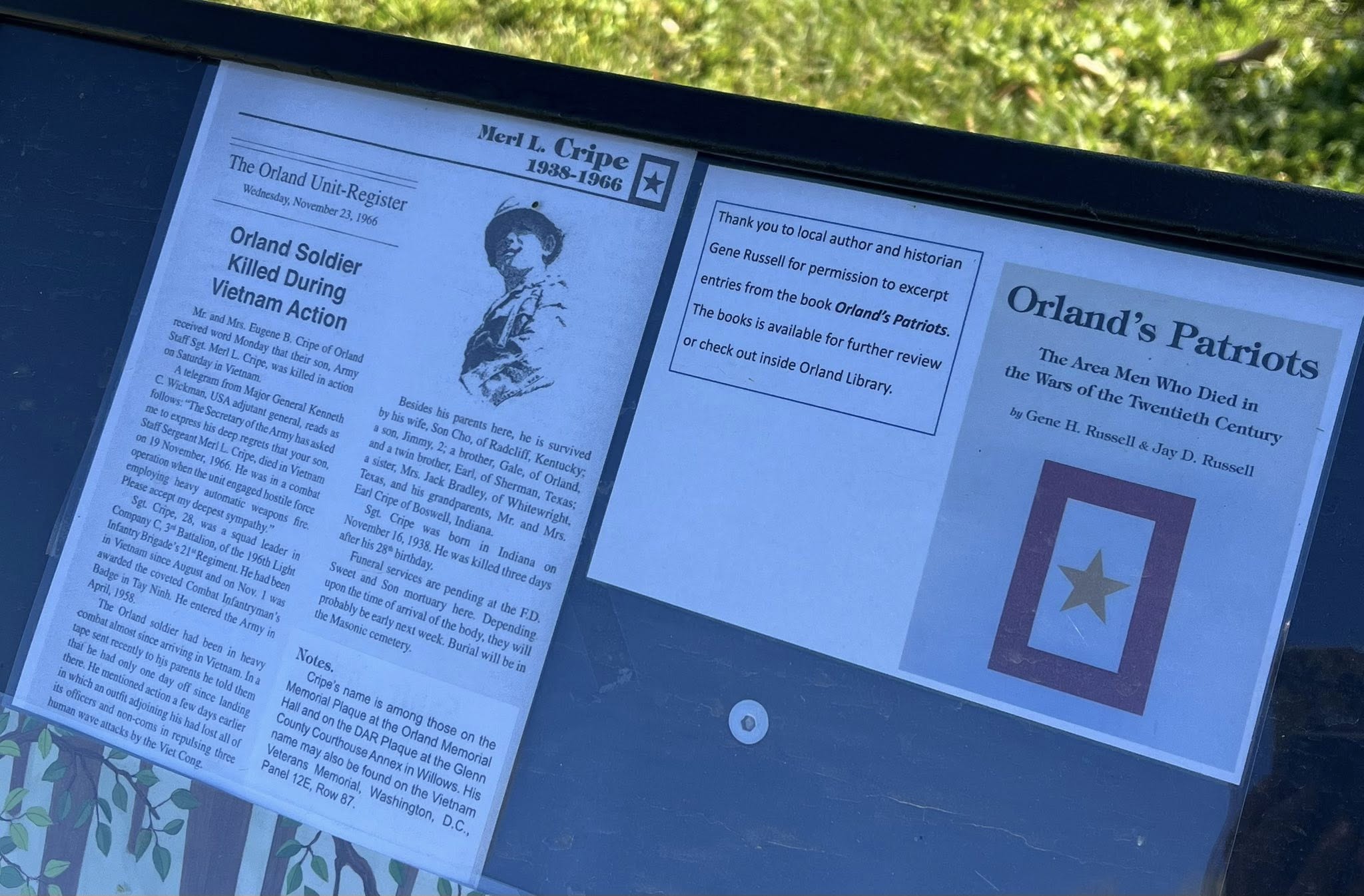Thank you local author and historian Gene Russell for permission to use excerpts from the book Orland’s Patriots.